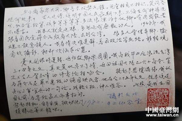 在照片背面,種志斌寫道:“蒼天開眼時運轉(zhuǎn),返歸故鄉(xiāng)樂團(tuán)圓。”(中國臺灣網(wǎng) 扶海濤 翻攝)