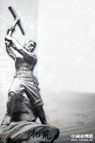天福集團(tuán)“唐山過(guò)臺(tái)灣”石雕園內(nèi)的“拓荒”雕像。(圖片翻攝自天福集團(tuán)宣傳冊(cè))