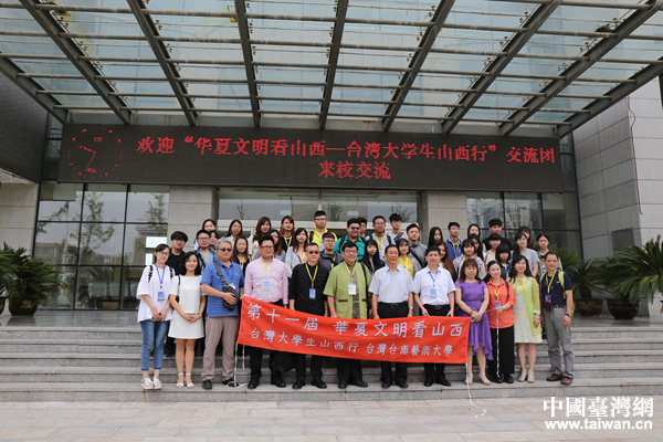 臺(tái)灣大學(xué)生山西行參訪交流團(tuán)在山西傳媒學(xué)院樓前合影。(中國臺(tái)灣網(wǎng) 袁楚 攝)