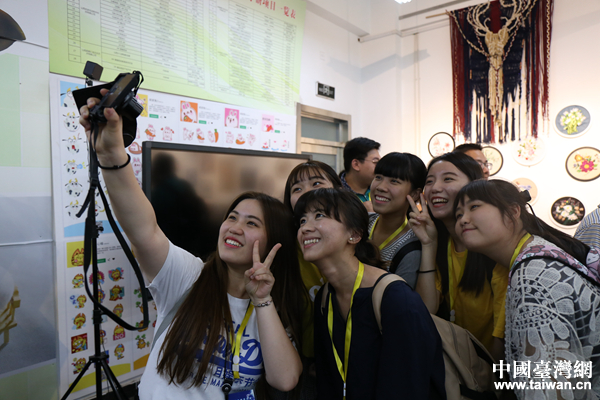 臺(tái)灣大學(xué)生參訪過程中不忘玩自拍。(中國臺(tái)灣網(wǎng) 袁楚 攝)