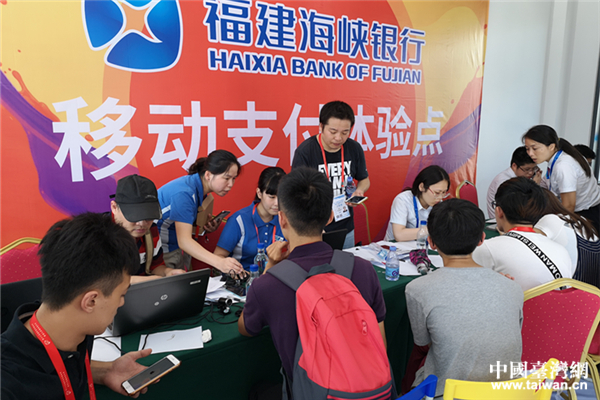 在海峽青年交流營地,臺灣青年排隊(duì)辦理移動(dòng)支付。(中國臺灣網(wǎng) 郜利敏 攝)
