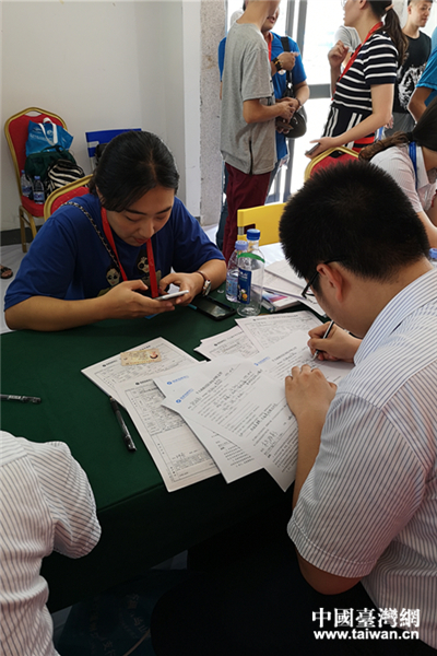 為了讓更多學(xué)生體驗(yàn)移動(dòng)支付,今年組委會(huì)邀請中國移動(dòng)公司、海峽銀行工作人員在營地聯(lián)合辦公,便捷臺青開通移動(dòng)支付。基于辦理人數(shù)激增,中國移動(dòng)公司和海峽銀行工作人員10日也增添了1組工作人員,以便快速幫助臺青辦理移動(dòng)支付。