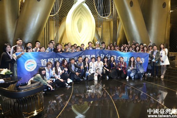兩岸媒體人在上海中心大廈內合影。(中國臺灣網 陳佳慧 攝)