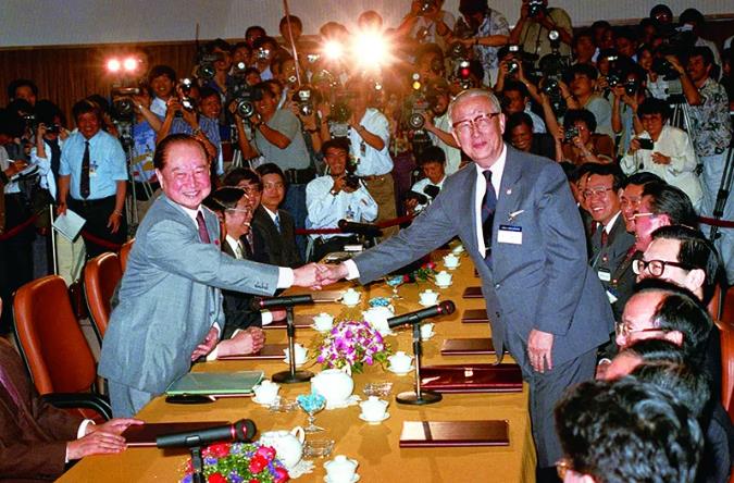 1993年4月27日,首次“汪辜會談”在新加坡開始,海協會和海基會代表各10人參加了會談,這是海峽兩岸授權民間機構領導人的第一次晤談。會談前汪道涵(左)與辜振甫握手。 新華社發