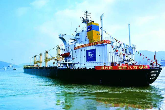 2008年12月15日,海峽兩岸海上直航福州港首航儀式舉行。圖為直航臺北港的貨輪徐徐離開福州馬尾港。 新華社記者 張國俊/攝