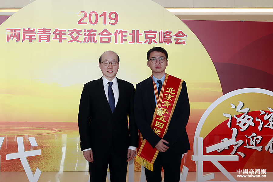 中央臺辦、國務院臺辦主任劉結一與首位獲得“北京青年五四獎章”的臺灣青年合影。(海淀區新聞中心供圖)