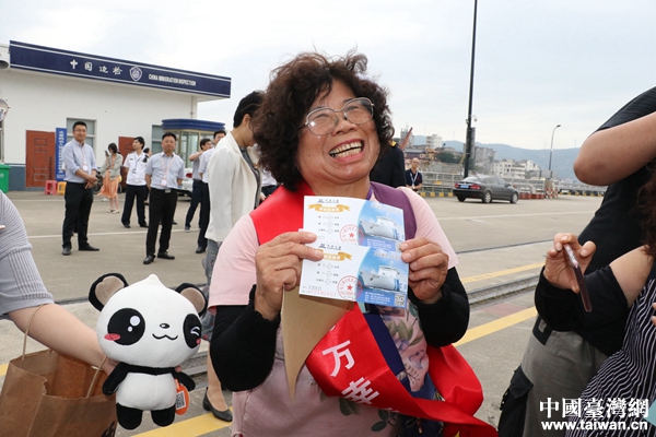 玉環(huán)市大麥嶼港對臺(tái)海上直航第20萬人次幸運(yùn)旅客劉細(xì)妹獲贈(zèng)“中遠(yuǎn)之星”往返船票一套。(中國臺(tái)灣網(wǎng) 普燕 攝)