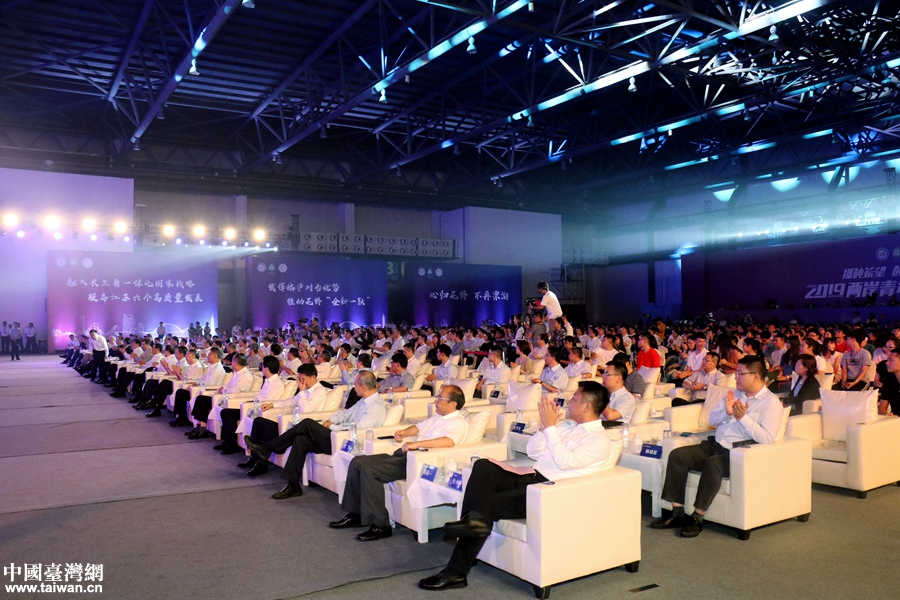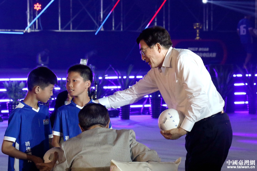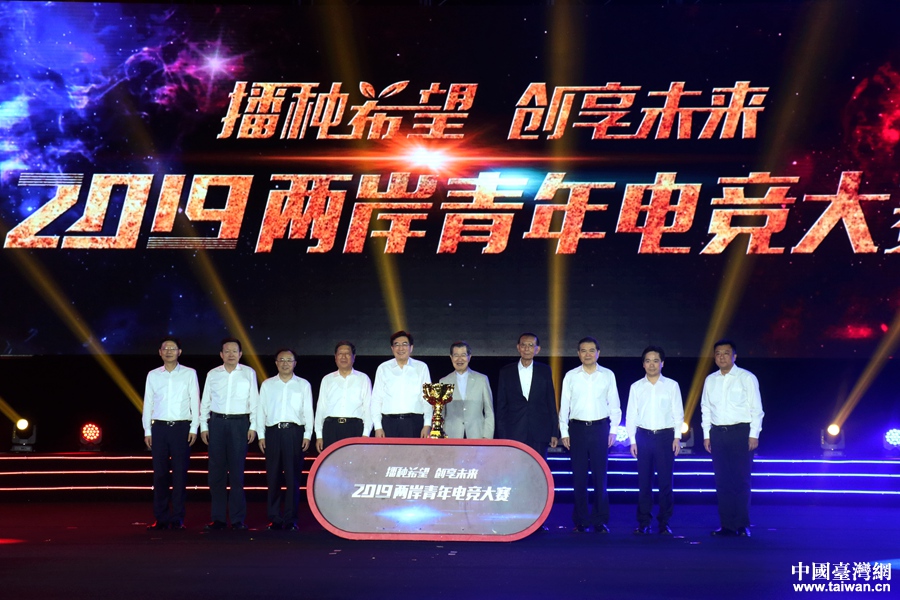 兩岸企業家峰會大陸方面理事長郭金龍,兩岸企業家峰會臺灣方面理事長蕭萬長等兩岸領導嘉賓共同見證2019兩岸青年電競大賽總決賽啟動。(中國臺灣網 尹賽楠 攝)