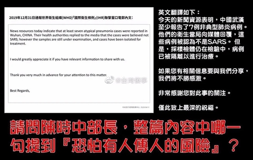 陳時中的解釋是,這封電郵中提及的“非典型肺炎”和“隔離治療”,就是“人傳人”的意思,這是內(nèi)行人的語言,你們外行人不要不懂裝懂。