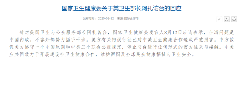 國(guó)家衛(wèi)生健康委關(guān)于美衛(wèi)生部長(zhǎng)阿扎訪臺(tái)的回應(yīng)。