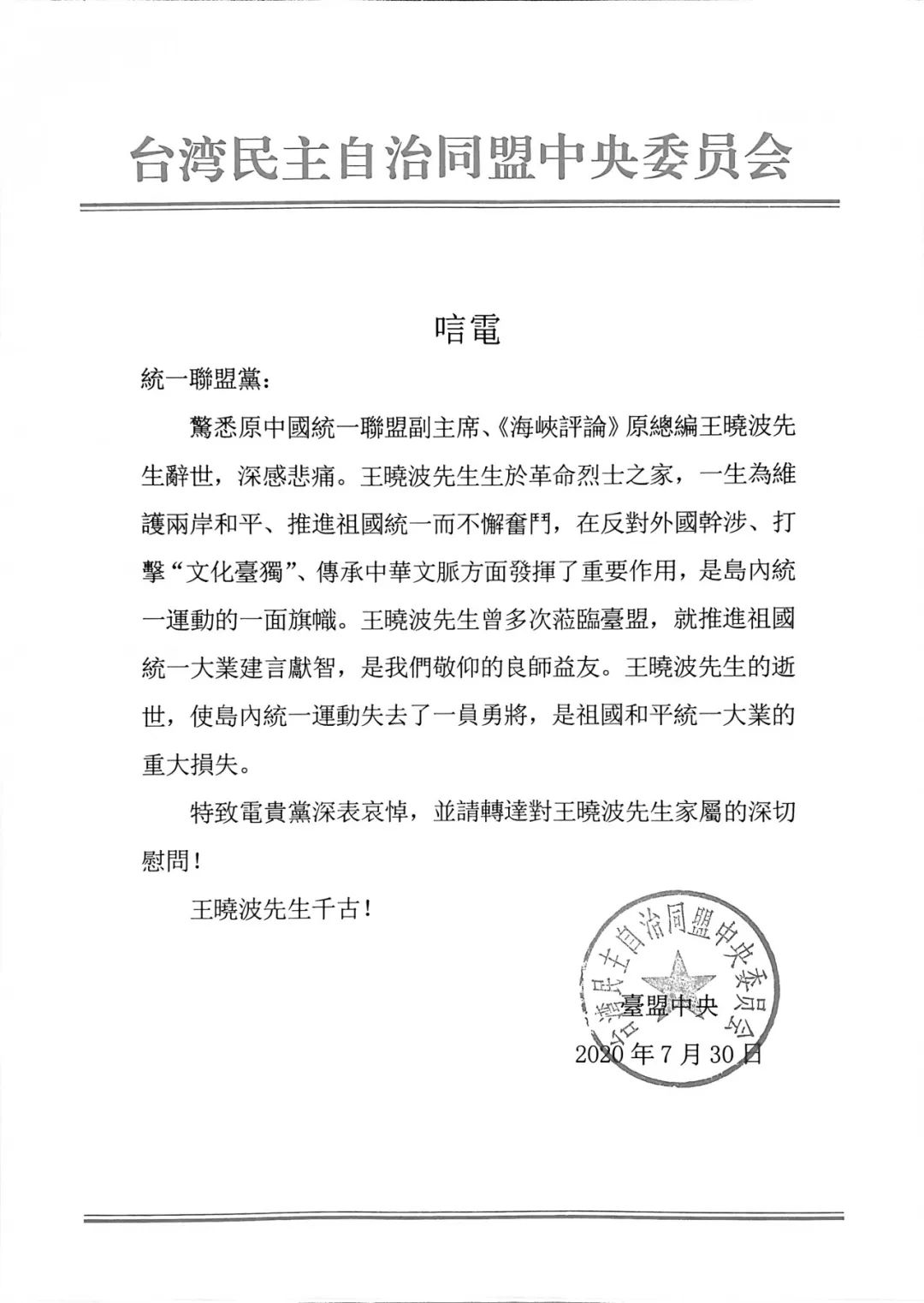 毛鑄倫先生、王曉波先生追思會在臺北舉行 臺盟致唁電