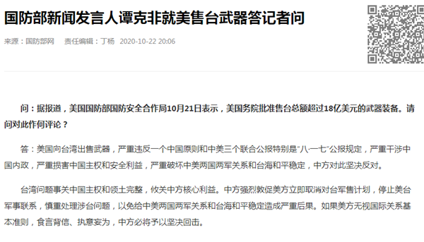 中國臺灣網(wǎng)10月23日訊 國防部新聞發(fā)言人譚克非22日就美售臺武器答記者問。針對有記者問:據(jù)報道,美國國防部國防安全合作局10月21日表示,美國務院批準售臺總額超過18億美元的武器裝備。請問對此作何評論?