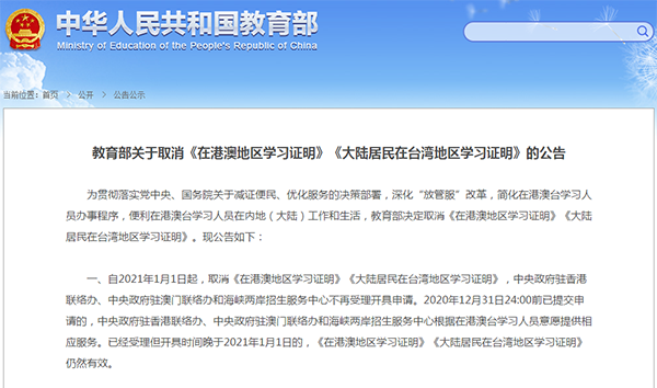 根據(jù)公告,自2021年1月1日起,取消《在港澳地區(qū)學(xué)習(xí)證明》《大陸居民在臺(tái)灣地區(qū)學(xué)習(xí)證明》,中央政府駐香港聯(lián)絡(luò)辦、中央政府駐澳門聯(lián)絡(luò)辦和海峽兩岸招生服務(wù)中心不再受理開具申請(qǐng)。2020年12月31日24:00前已提交申請(qǐng)的,中央政府駐香港聯(lián)絡(luò)辦、中央政府駐澳門聯(lián)絡(luò)辦和海峽兩岸招生服務(wù)中心根據(jù)在港澳臺(tái)學(xué)習(xí)人員意愿提供相應(yīng)服務(wù)。已經(jīng)受理但開具時(shí)間晚于2021年1月1日的,《在港澳地區(qū)學(xué)習(xí)證明》《大陸居民在臺(tái)灣地區(qū)學(xué)習(xí)證明》仍然有效。