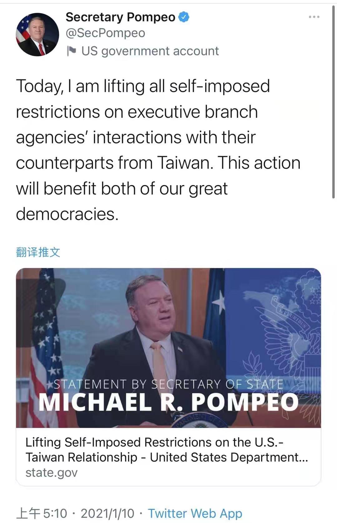 中國臺灣網1月10日訊 特朗普政府距離卸任不足兩周,在涉臺問題上連續拋出“瘋狂之舉”。據環球網引述法新社報道,美國務卿蓬佩奧9日在社交媒體發文,宣稱“美方將停止美國官方在與臺灣接觸上的限制”。臺媒也報道稱,美國國務院宣布取消美臺交往限制,是特朗普對臺灣的“卸任大禮”。