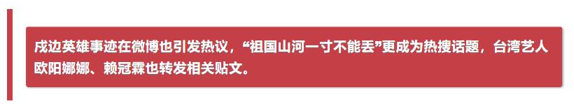 戍邊英雄事跡在微博也引發(fā)熱議,“祖國山河一寸不能丟”更成為熱搜話題,臺灣藝人歐陽娜娜、賴冠霖也轉(zhuǎn)發(fā)相關(guān)貼文。