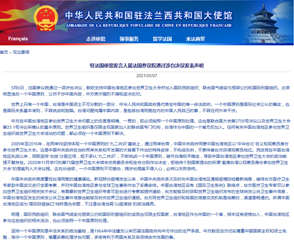 聲明指出,5月6日,法國參議院通過一項涉臺決議,鼓吹支持中國臺灣地區參加世界衛生大會并加入國際民航組織、聯合國氣候變化框架公約和國際刑警組織。此舉明顯違反一個中國原則,公然干涉中國內政,中方表示強烈不滿和堅決反對。