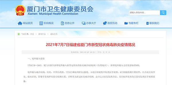 中國臺灣網7月7日訊 廈門市衛生健康委員會7日通報, 7月6日0—24時,廈門市報告新增境外輸入新型冠狀病毒肺炎確診病例1例(臺灣地區),新增境外輸入無癥狀感染者0例