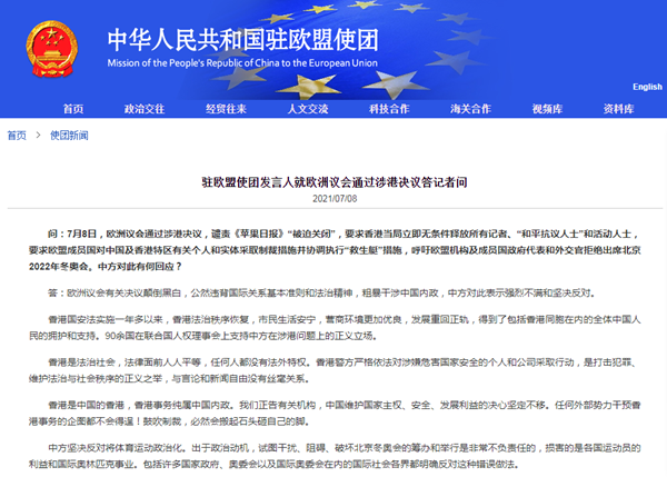中國臺灣網(wǎng)7月9日訊 中國駐歐盟使團(tuán)發(fā)言人8日就歐洲議會通過涉港決議答記者問。針對有記者問:7月8日,歐洲議會通過涉港決議,譴責(zé)《蘋果日報(bào)》“被迫關(guān)閉”,要求香港當(dāng)局立即無條件釋放所有記者、“和平抗議人士”和活動人士,要求歐盟成員國對中國及香港特區(qū)有關(guān)個人和實(shí)體采取制裁措施并協(xié)調(diào)執(zhí)行“救生艇”措施,呼吁歐盟機(jī)構(gòu)及成員國政府代表和外交官拒絕出席北京2022年冬奧會。中方對此有何回應(yīng)?