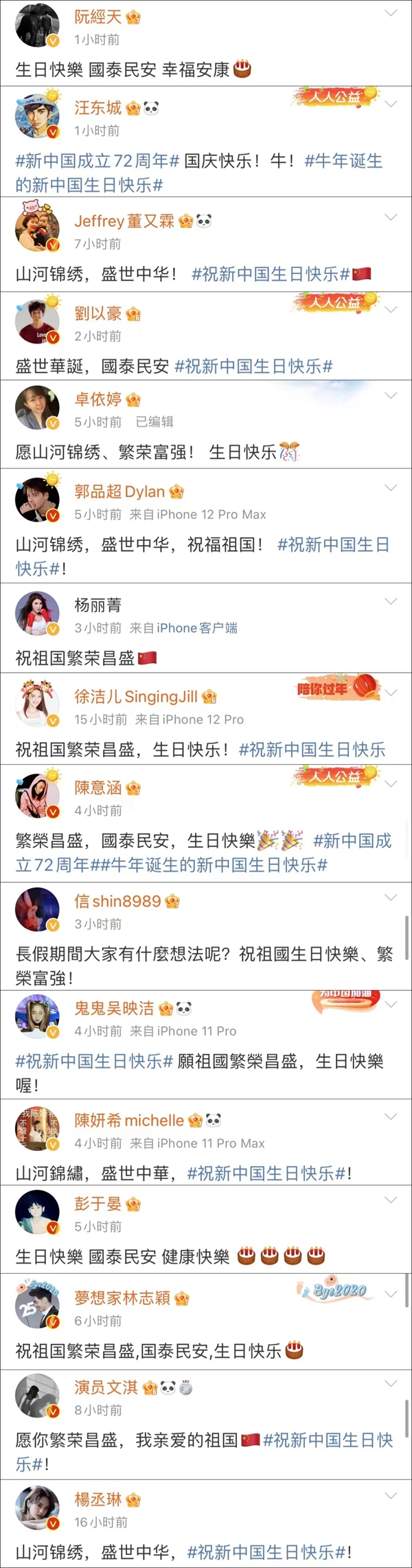 轉(zhuǎn)發(fā)“祝新中國(guó)生日快樂(lè)”相關(guān)微博的遠(yuǎn)不止這幾位臺(tái)灣藝人,歐陽(yáng)娜娜、王大陸、賴冠霖、陳立農(nóng)、焦恩俊、林志穎、楊麗菁、徐潔兒、陳志朋、楊丞琳、陳妍希、阿信、彭于晏、阮經(jīng)天、吳映潔、陳意涵、辰亦儒、汪東城、董又霖、劉以豪、林佑威、卓依婷、文淇等也表達(dá)了自己的心聲,綠媒怕是快要酸不過(guò)來(lái)了……