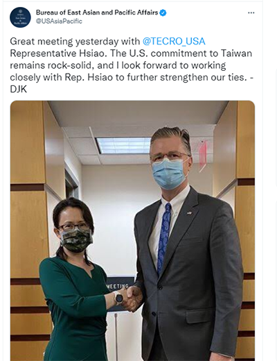 美國(guó)國(guó)務(wù)院有關(guān)社交媒體賬號(hào)高調(diào)發(fā)布副國(guó)務(wù)卿費(fèi)爾南德斯、亞太事務(wù)助卿康達(dá)與蕭美琴見(jiàn)面的照片及貼文。(美國(guó)國(guó)務(wù)院有關(guān)社交媒體賬號(hào)截圖)