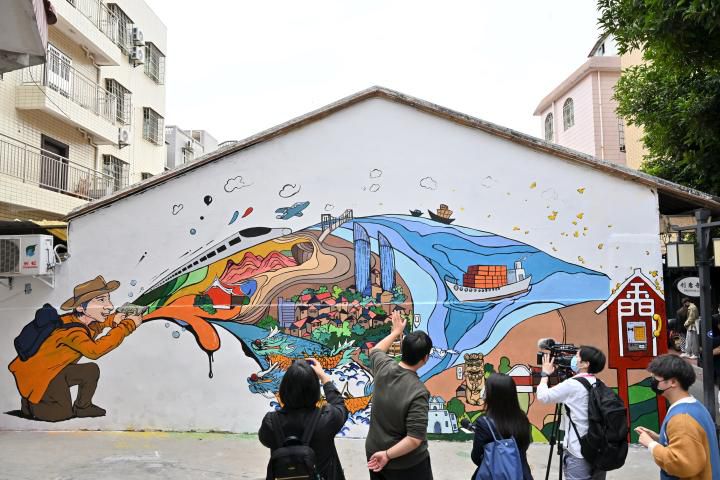 12月10日,在廈門市集美區(qū)大社文創(chuàng)旅游街區(qū),2021海峽論壇第三屆創(chuàng)意涂鴉大獎(jiǎng)賽優(yōu)秀設(shè)計(jì)獎(jiǎng)作品《海峽一日游》作者(左二)向媒體介紹畫作內(nèi)容。新華社記者 姜克紅 攝