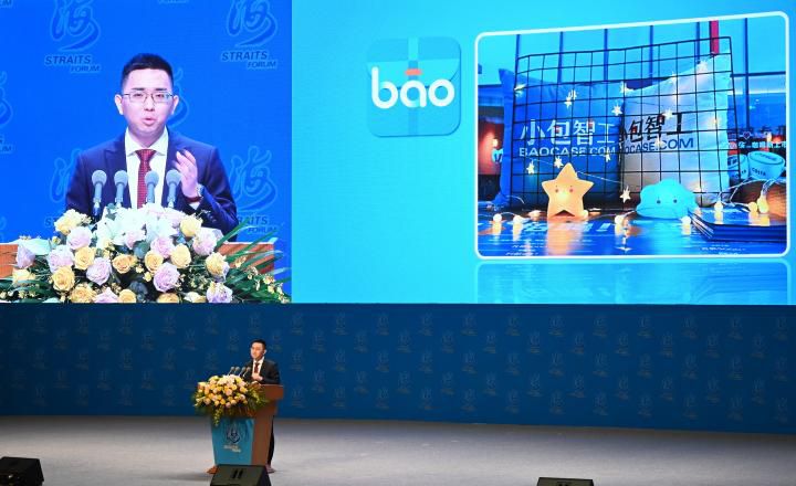 小包智工聯(lián)合創(chuàng)始人徐韜在第十三屆海峽論壇大會(huì)上發(fā)言。新華社記者 林善傳 攝