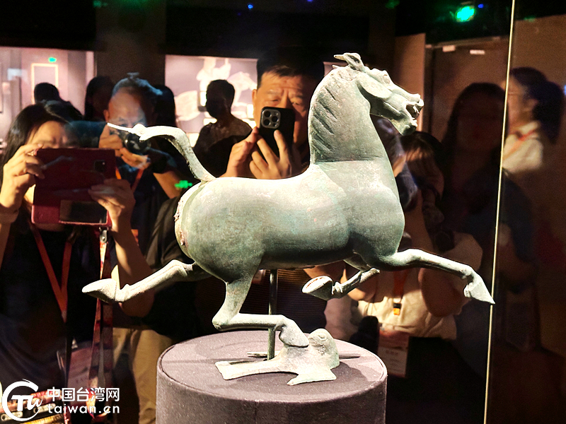 甘肅省博物館鎮(zhèn)館之寶“銅奔馬”(也被稱為“馬踏飛燕”)。圖為媒體在拍照留念。(中國臺灣網(wǎng) 李柏濤 攝)