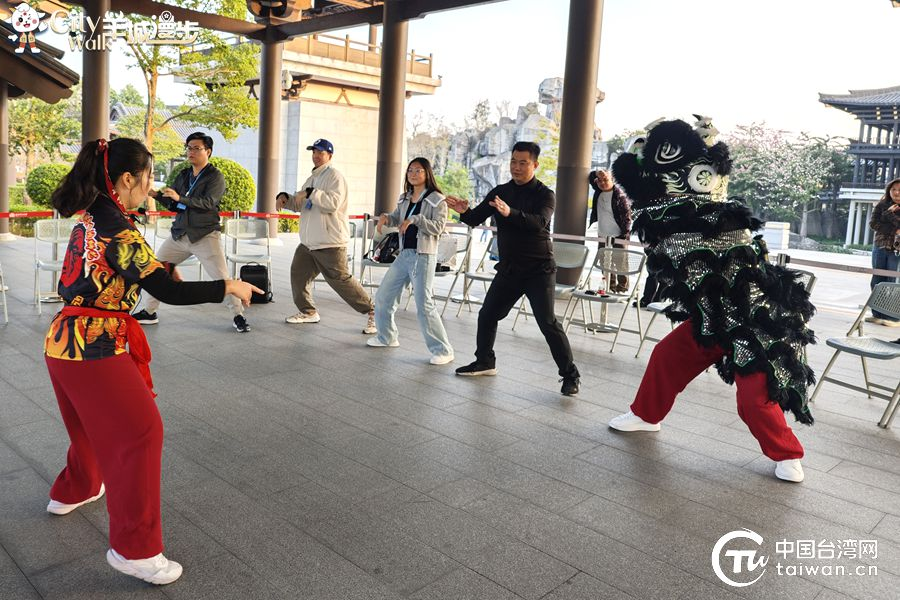 兩岸暨港澳媒體人跟著黃飛鴻第五代傳人鄧穎琪學舞獅。(中國臺灣網記者 張亞靜 攝)