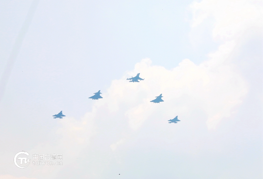 殲擊機(jī)梯隊(duì)飛過天安門廣場上空。(中國臺灣網(wǎng)記者 尹賽楠 攝)