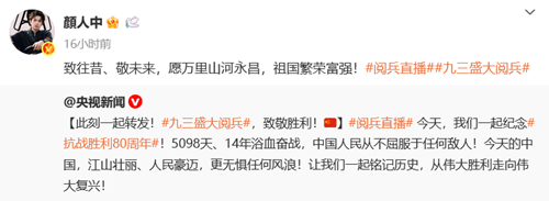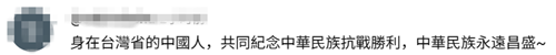 臺(tái)灣網(wǎng)友在相關(guān)內(nèi)容下留言表示,“作為一個(gè)堂堂正正的中國(guó)人,今天真的很驕傲”,“身在臺(tái)灣省的中國(guó)人,共同紀(jì)念中華民族抗戰(zhàn)勝利,中華民族永遠(yuǎn)昌盛”,“身為臺(tái)灣人,盡管政治體系不同,依然為了中國(guó)人民跟中國(guó)的強(qiáng)大而驕傲”。
