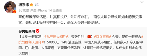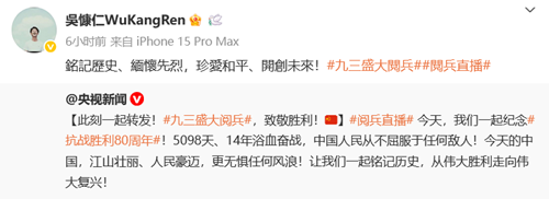 而無(wú)懼臺(tái)灣陸委會(huì)關(guān)于“不要呼應(yīng)大陸所謂‘統(tǒng)戰(zhàn)’宣傳,尤其是九三閱兵”的威脅恐嚇,舒淇、伊能靜、吳奇隆、楊宗緯、文淇、吳慷仁、顏人中等多名臺(tái)灣藝人也紛紛在社交平臺(tái)轉(zhuǎn)發(fā)央視新聞貼文,表達(dá)銘記歷史、紀(jì)念英烈、珍視和平的心聲。(文/文方)