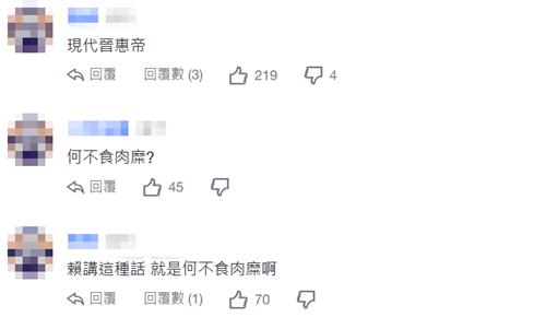 許多網友表示,“這句話就是韓國瑜說得比較貼切,莫忘臺灣人沒自己房子住的人太窮苦了”“宮廷內怎知世上苦人多”“人民生活痛苦指數你可知道!有錢有閑?薪水追不上物價”。
