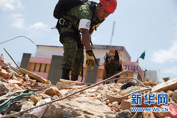 9月9日,在墨西哥瓦哈卡州胡奇坦,搜救人員和搜救犬在房屋廢墟上進(jìn)行搜救。根據(jù)墨西哥政府發(fā)布的最新數(shù)據(jù),截至9日晚,墨西哥地震遇難人數(shù)已上升至90人。墨西哥軍方和國防部開始向受災(zāi)最嚴(yán)重的瓦哈卡州胡奇坦增派救援人員,為當(dāng)?shù)孛癖娞峁┤说涝P氯A社記者淡航攝