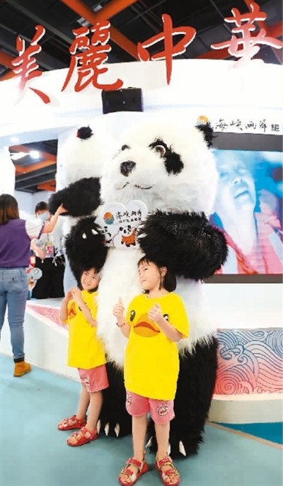 圖為二〇二〇臺北夏季旅展兩岸展區,小朋友和熊貓人偶合影。