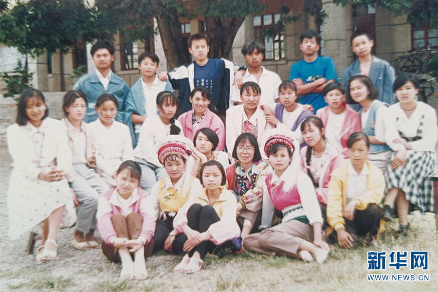1995年,張桂梅在大理喜洲一中任教,和學生在一起合影(資料圖)。新華網發(華坪縣融媒體中心 供圖)