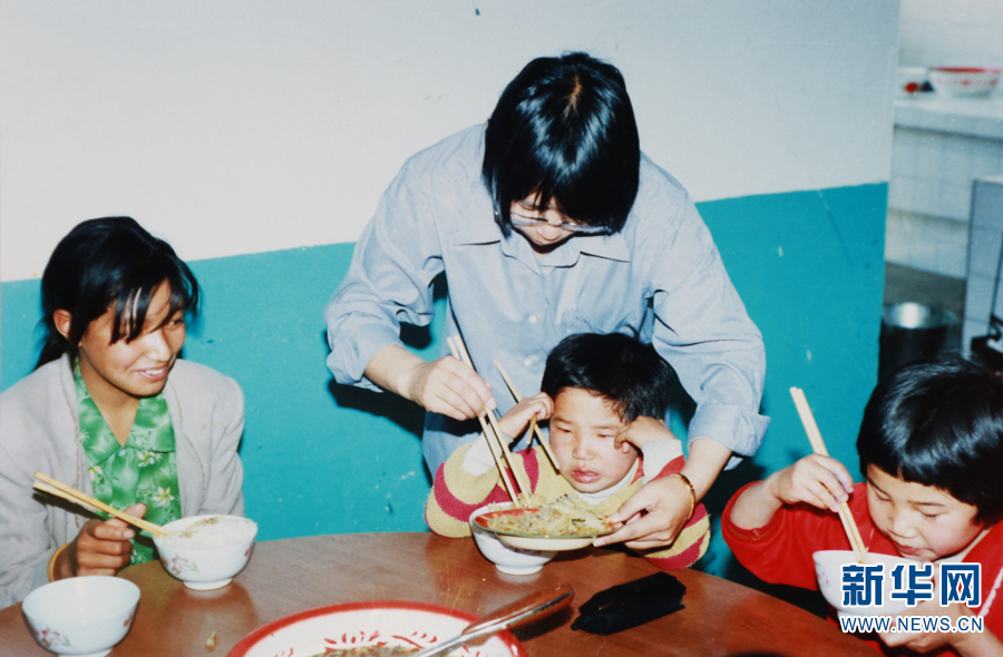 2002年,張桂梅在“兒童之家”照顧孩子們吃飯(資料圖)。新華網發(華坪縣融媒體中心 供圖)