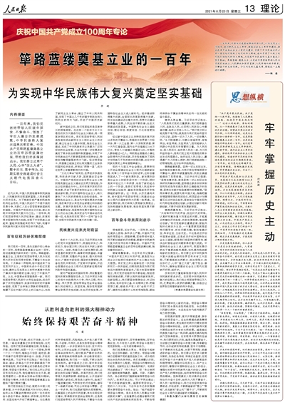 一百年來,中國共產(chǎn)黨團結(jié)帶領(lǐng)中國人民,以馬克思主義為指導,進行新民主主義革命,推進社會主義革命和建設(shè),推動改革開放和社會主義現(xiàn)代化建設(shè),實現(xiàn)了中華民族近代以來從落后時代到趕上時代的偉大跨越,進而實現(xiàn)了從趕上時代到引領(lǐng)時代的偉大跨越,為實現(xiàn)中華民族偉大復興奠定了堅實基礎(chǔ)。篳路藍縷、奠基立業(yè),正是我們黨團結(jié)帶領(lǐng)人民為實現(xiàn)民族獨立、人民解放和國家富強、人民幸福而艱辛探索、不懈奮斗的生動寫照。今天刊發(fā)的幾篇文章,圍繞這一主題進行闡釋。