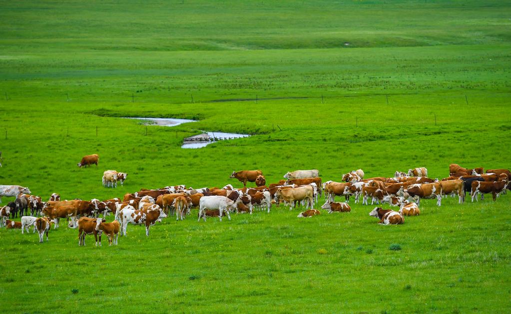 2021年7月15日,牛群在內蒙古錫林郭勒盟東烏珠穆沁旗的草原上悠閑覓食。新華社記者彭源攝