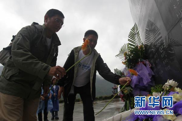 5月9日,在“5.12”汶川地震重災區四川省青川縣東河口地震遺址公園,在青川參加災民安置房援建工作的香港迪士尼樂園志愿者面向遇難者紀念碑獻花。東河口地震遺址公園是汶川大地震第一個地震遺址保護紀念地,震后保留的豐富地貌形象地展現著那場大地震的傷痛與記憶。在“5·12”四川汶川大地震3周年來臨之際,遺址公園吸引了來自各地的人們到此駐足、默哀,緬懷逝者。(新華社記者 任正來 攝 )