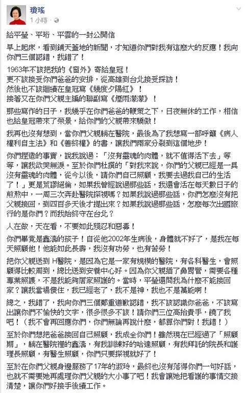 5月2日晚間,瓊瑤發文向3名繼子女道歉,同時反指對方捏造事實,并說暫時不會去探視丈夫,“我現在萬念俱灰,也不再相信人間有情”;5月6日晚間,她又突然在臉譜網上發長文與粉絲道別,宣布自己即將關閉臉書,“這次是‘珍重再見,后會無期’了!”;8月1日,瓊瑤無視繼子女的不滿和公開諷刺,為以記錄她與第二任丈夫“老夫老妻”生活的新書《雪花飄落之前:我生命中最后的一課》公開露面,自曝曾與老公“相約去死”的秘密約定。
