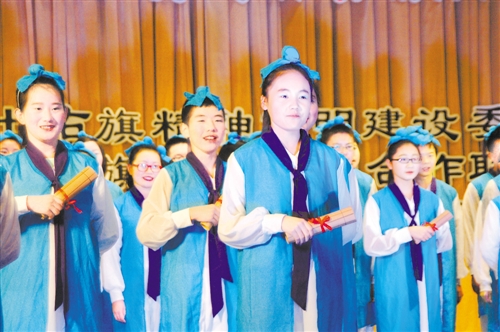 圖為頒獎(jiǎng)晚會(huì)上土右旗民一中學(xué)生在朗誦《弟子規(guī)》,用傳統(tǒng)文化告訴人們,“凡出言,信為先”。
