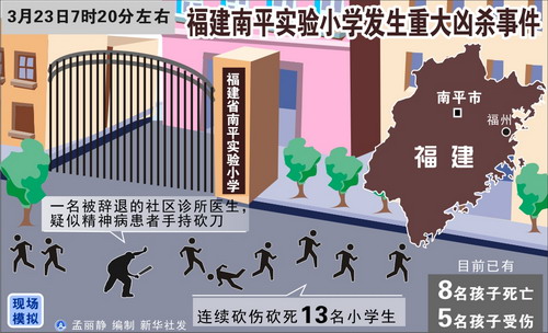 3月23日7時20分左右,正逢孩子上學的時間,福建省南平市實驗小學門口,一名中年男子手持砍刀,連續砍傷砍死13名小學生,截至記者發稿時已有8名孩子死亡,5名孩子受傷。受傷孩子目前正在南平中醫院和市立醫院全力搶救。目前案件調查、審理和善后工作正在進行中。