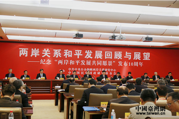 中共中央臺(tái)辦海峽兩岸關(guān)系研究中心與中國國民黨國政研究基金會(huì)共同舉辦、南京大學(xué)臺(tái)灣研究所協(xié)辦的“兩岸和平發(fā)展共同愿景”發(fā)布十周年紀(jì)念活動(dòng)今天在南京舉行;顒(dòng)包括“兩岸和平發(fā)展共同愿景”發(fā)布十周年圖片展和“兩岸關(guān)系和平發(fā)展回顧與展望”學(xué)術(shù)研討會(huì)。中共中央臺(tái)灣工作辦公室主任張志軍、中共江蘇省委書記羅志軍、中國國民黨副主席郝龍斌以及國共兩黨代表、兩岸專家學(xué)者近百人出席。