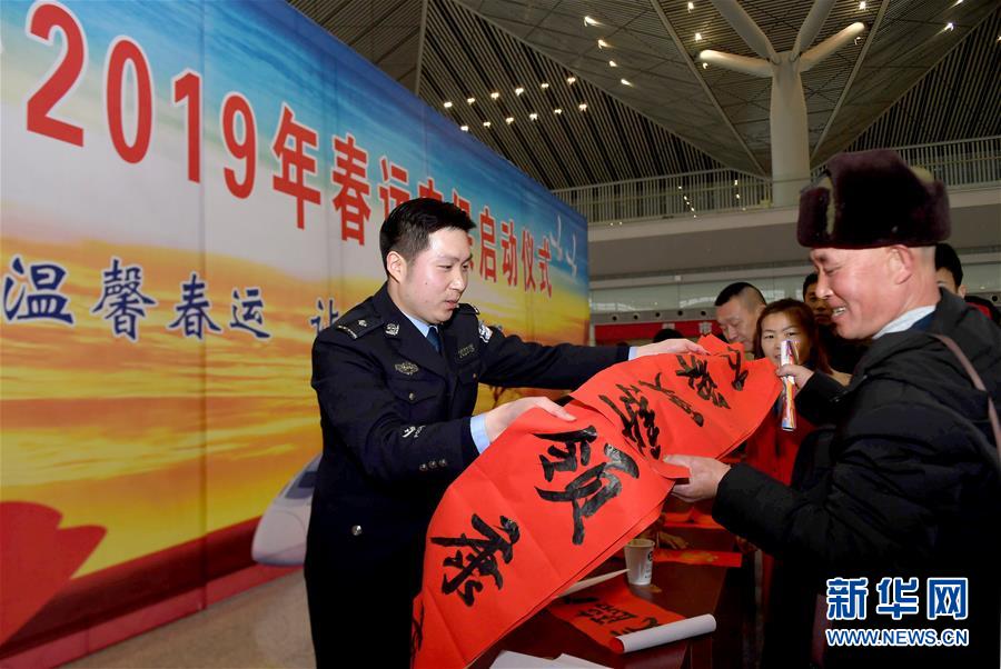 1月20日,在西安北客站,鐵路民警為旅客送上自己書寫的春聯。