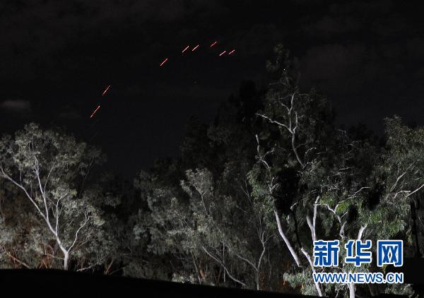 這是3月22日晚在利比亞首都的黎波里拍攝的橘紅色的防空炮火。的黎波里市區(qū)當(dāng)?shù)貢r間22日晚8時30分(北京時間23日凌晨2時30分)左右,又響起密集的防空炮聲,人們可看到橘紅色的防空炮火射向天空。 新華社記者 楊光 攝