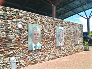 15日,在曼德拉故鄉(xiāng)古努村,媒體區(qū)入口處的紀(jì)念墻上掛著曼德拉頭像。 (本報(bào)記者邢磊攝)
