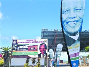 15日,在曼德拉故鄉(xiāng)古努村,飄著曼德拉頭像的大幅海報(bào)。 (本報(bào)記者邢磊攝)