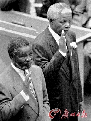 1994年5月9日,曼德拉(右)在南非國民議會上宣誓就任總統(tǒng)。 (資料圖片)
