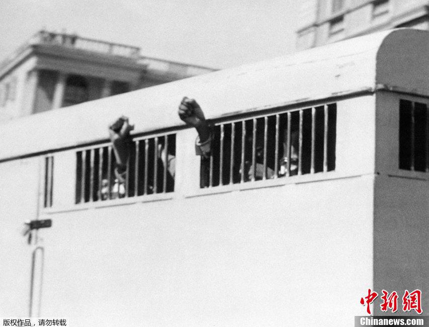 1964年6月,曼德拉被指控犯有“企圖以暴力推翻政府”,判處無期徒刑。圖為1964年6月16日,南非比勒陀利亞,包括曼德拉在內的8人被關進監獄。