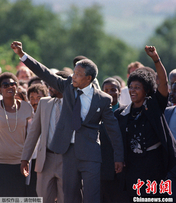 1990年2月11日,南非當(dāng)局在國內(nèi)外輿論壓力下,被迫宣布無條件釋放曼德拉。他隨即前往約堡的索維托足球場,面向12萬人發(fā)表了著名的“出獄演說”。圖為當(dāng)?shù)貢r間1990年2月11日,曼德拉從監(jiān)獄釋放后與妻子溫尼高舉拳頭向人們示意。